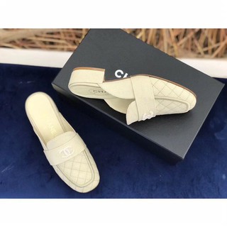 Chanel 20P Beige Lambskin Pearl CC Logo Backless Slide Mule Loafer Very well made.